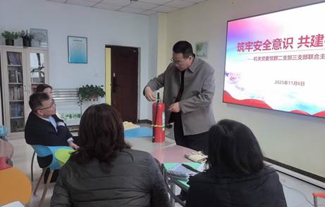2025年11月9日是第34个全国消防日。为深入学习贯彻习近平总书记关于消防和安全的重要讲话、重要批示精神,筑牢消防安全意识,11月6日,学校机关党委党群第二党支部与第三党支部开展“筑牢安全意识 共建平安校园”联合主题党日活动,学校纪委书记史红斌以普通党员身份参加活动。